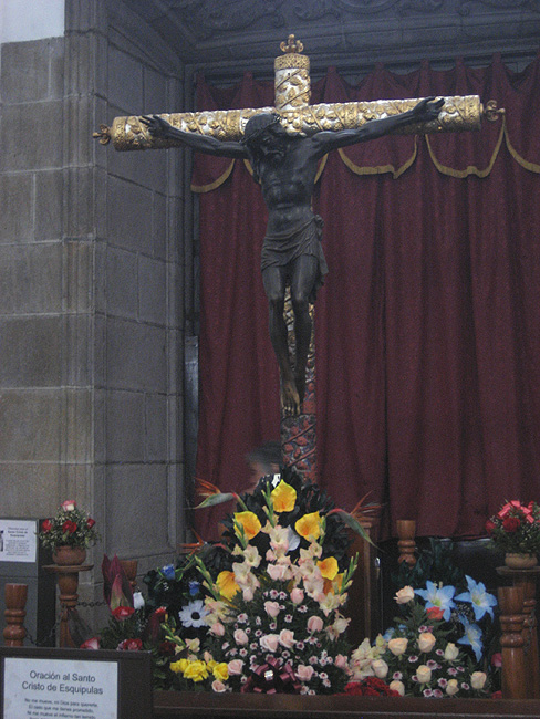 Comments: This is the cathedral's most significant side altar. It is a crucifix of the Cristo de Esquipulas. It is known as the Black Christ of Esquipulas because the original crucifix is in the cathedral in the Guatemalan city of Esquipulas. For many Catholics, the black color of the wood crucifix, which has existed for more than four hundred years, reminds Catholics of the dark skin of the native peoples of Guatemala and Mesoamerica. The feast day for this Christ is January 15th. Since many Central Americans now live in the United States, the feast day is also observed in cities such as, Los Angeles and New York.
