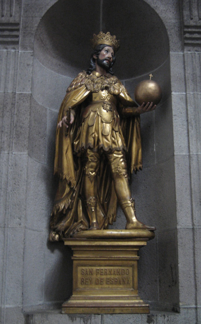 Comments: In a niche on the Cathedral's north wall, we find this bronze statue of San Fernando Rey de España (Saint Fernando, King of Spain). The statue represents king Fernando III of Castilla (1201-1252). He was canonized as a saint by Pope Clement X in 1671. Fernando III is most renowned as the Spanish king who conquered Córdoba (1236) and Sevilla (1248) from the Muslim Andalusians. In 1252 he was preparing to invade North Africa.