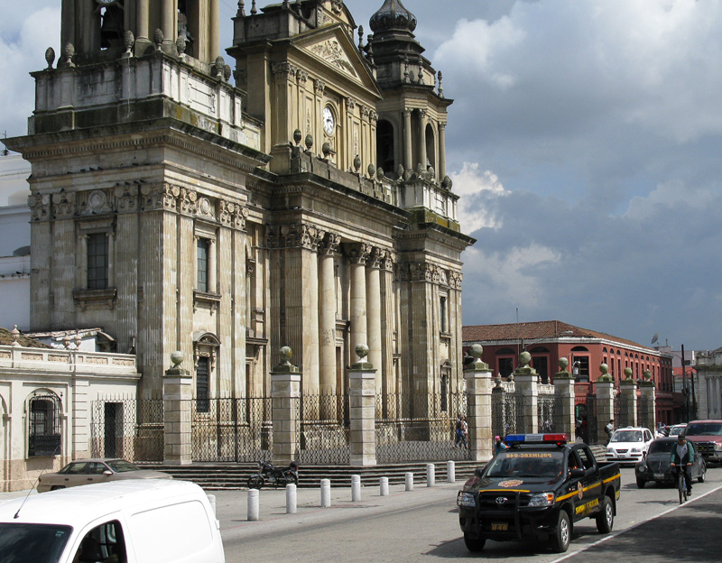 Source: WTL© digital photograph (2008) taken on site in Guatemala City. Comments: Let's take one more look outside the Catedral de Santiago. In the right foreground you see a municipal security pickup. In recent years Guatemala has created a special policy unit for reduce crime in the major tourist areas. Now, what is possibly most notable about the cathedral are the twelve pillars which surround and protect (?) the cathedral? They are monuments to the thousands of victims--los desaparecidos (the disappeared) who were killed during the most recent civil war, which lasted 30 horrible years. For two close-up views of these pillars, see: => Guate City #19a. |
