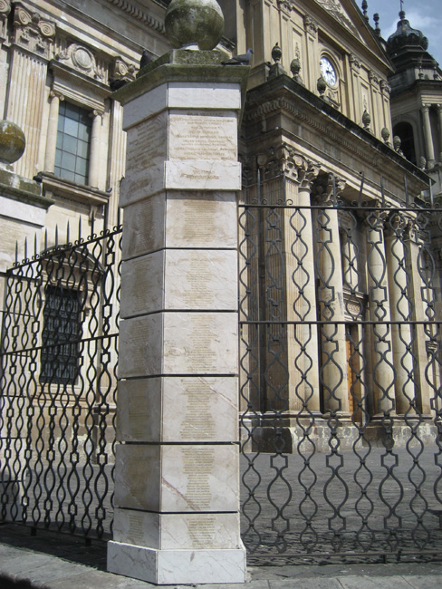 Source: WTL© digital photograph (2008) taken on site in Guatemala City. Comments: Here is one of the pillars. Notice the writing up and down the pillar. Those are lists of some of the names of the desaparecidos. Humanities questions: What do you think about the meaning and effect of placing these pillars in front of the Catedral de Santiago? What kinds of items that are possibly parallel to these pillars from the pre-Columbian era in Latin America do they remind you of? (Hints, they record historical names and they seem to be standing guard.) |