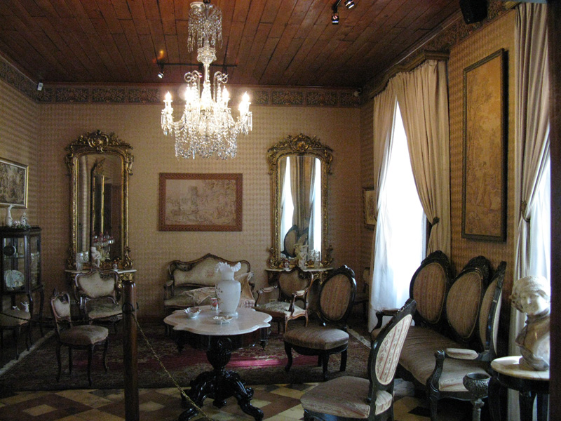 Source: WTL© digital photograph (2008) taken on site in Guatemala City. Comments: Again crossing the patio diagonally from the last photo and entering a room at the NE corner of the home (at the street corner), one enters this elegant living room. Humanities topics: Describe the style of these furnishings from floor to ceiling. |