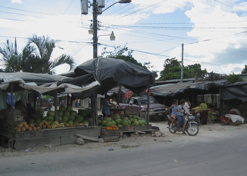 Source: WTL© digital photograph (2008) taken on site in Santa Elena. Comments: Immediately across the causeway, back on the mainland, we see this commercial activity in Santa Elena (pop. 29,000; elev. 350 ft), which is where one finds the banks, markets, buses, and the regional airport. |