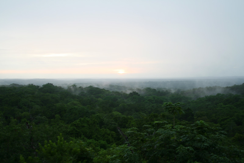 Source: WTL© digital photograph taken at sunrise from atop Tikal's Pyramid #4 looking east. Comments: This photo is placed here early in the presentation of Tikal to evoke the mythico-religious ethos of Tikal's time and place. One guidebook says this: "It's wise to arrive early at Tikal when the air is fresh and heat less intense, but note that it's rare to witness an impressive sunrise over the ruins as the appearance of the sun is generally delayed by mist rising from the humid forest" (Rough Guide, p. 345). The "meaning" of "tikal": Among several interpretations of the word tikal are these two: (A) In Yucatecan Maya ti means 'place', and k'al means 'spirits'; hence, Tikal = "place of spirits." (B) Also in Yucatecan Maya k'al means 'count of twenty'; and, since twenty years in Maya is k'atun, therefore, Tikal = "place of the count of a k'atun (i.e., unit of twenty years). The accords with the glyph for Tikal, which is a mutul, that is, a tied knot of hair or a tied bundle as in a tied bundle of years. Tikal, then, might allude to the sacred place where the Maya time count was sanctified and maintained. Notions for HUM 2461: (1) the creation myths and stories in the Popol Vuh; (2) Latin American humanities arising from and being shaped by the earth (lo ctónico); (3) the precontact peoples' east-west orientation with the sun (i.e., the sun god) rising in the east as the beginning of a cyclical struggle between good (life) and evil (death); and (4) the simple beauty of rainforest nature. Note: the noise from the forest's animals at the foot of this pyramid was almost deafening. In other words, a faunal symphony accompanies this photo. |