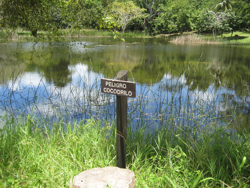 Comments: This sign says: "Danger. Crocodiles." It is standing in front of one of the remaining water reservoirs placed strategically around the Tikal city-state. Another sign next to this reservoir says: "The Maya constructed complicated canal networks that carried water from higher elevations to several kinds of reservoirs. The canals served the drainage system associate with the city's various plazas and groupings of buildings. A cement floor is all that has been needed to make this two-thousand year-old system function again." |