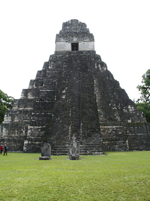 Source: WTL© digital photograph taken facing Temple I at Tikal (2008). Comments: This is Tikal's most celebrated pyramid. It is about 140 feet high and it has nine levels below its temple and roof comb at the top. It is called the Jaguar Temple due to a jaguar carved on the lintel of the door to the temple. It is likely that the temple top was painted cream, red, and green. This temple was built to honor the wife of the greatest ruler of Tikal, Hasaw Chan K'awil (682-721), who led Tikal's warriors in the defeat of Calakmul, their archenemy city-state. Hasaw's wife, Lady Twelve Macaw, died in 703. His tomb is found in this pyramid's core, along with precious things that accompanied the dead ruler in the afterlife: jade, pearls, seashells, sacrificed servants, and a jade vessel representing his beloved wife (see: => Tikal #11a). Humanities question: Since this pyramid-temple was the grandest building created by the Maya up to the 8th century, what do you see in its design and construction that Maya rulers intended to communicate to the Maya community of Tikal and elsewhere by means of this architecture? |
