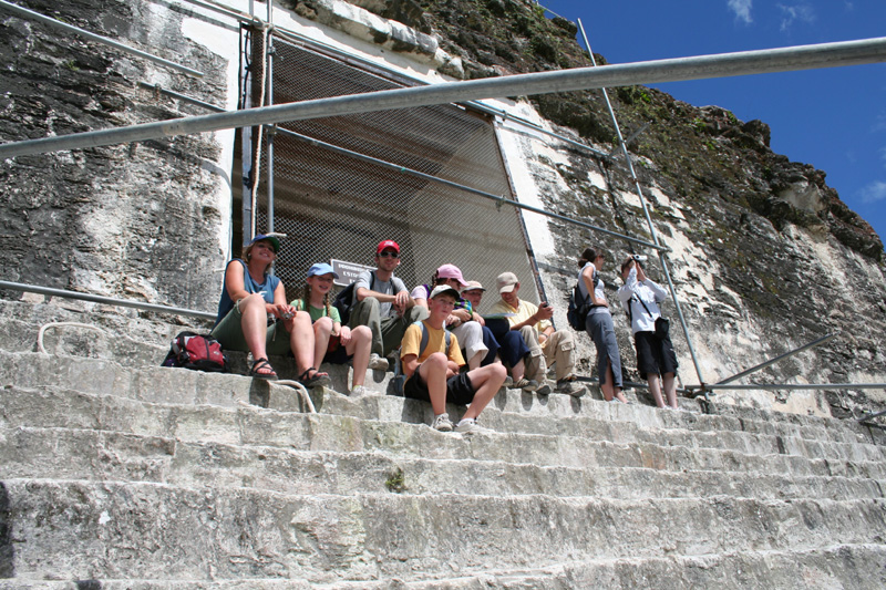 Comments: Here are a few tourists sitting on these steps near the top of Temple IV. Behind these happy people you see a fence protecting the temple room which is where the Maya's priests performed their most sacred rituals. (Entrance to the temple room is blocked in order to prevent vandalism, most especially foreign graffiti practitioners.) To see one of the views of what these folks see from this vantage point, see: