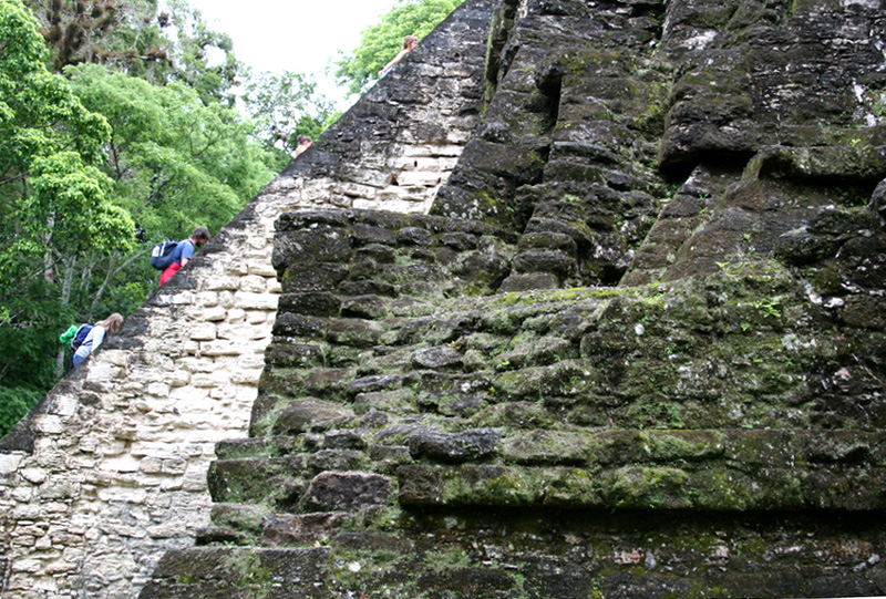 Source: WTL© digital photograph taken on site at Tikal, Guatemala. Comments: At the left we see some Spanish tourists climbing the central stairway of the Gran Pirámide. The humanities (history of architecture) focus of this photo is seen in the dark stone to the right of the stairway. What is exposed here are this pyramid's five successive construction levels. In other words, the rulers of the Mundo Perdido rebuilt this pyramid five times by constructing newer levels over each previous form of the pyramid. For a couple more view of the Gran Templo, see: => Tikal #24a. |