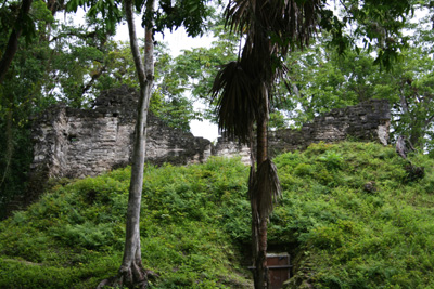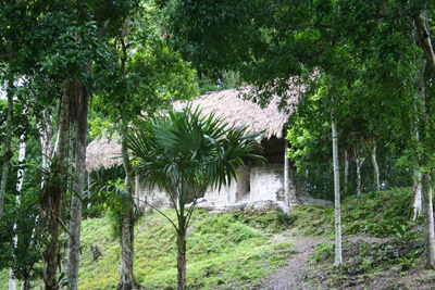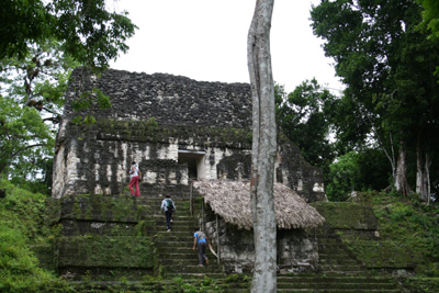 Source: WTL© digital photographs (2008) taken on site in the Mundo Perdido area of Tikal. Comments: This series of three photographs illustrates three buildings the Maya used for solar observations. One of the Maya's calendar years was of 365 days; with these three buildings, they calculated the precised days of the two equinoxes and the two solstices per year. When the sun struck an altar in the building in #26a it indicated the winter solstice, the shortest day of the year. The building in the middle, #26b, indicated both the autumnal and spring equinoxes. And, when the sun was in position to indicate the year's longest day, the building on the right, #26c, would signal the vernal solstice. For a chart of how the Maya calculated time and Maya terminology relating to time, see: => Maya Region Notes. |