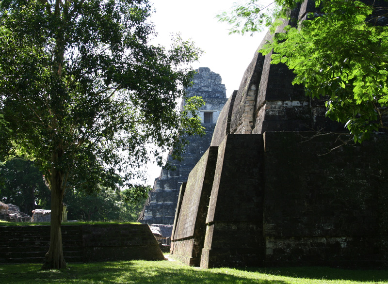 Source: WTL© digital photograph (2008) taken on site at Tikal. Comments: To end this narrated virtual journey, we now return to the first significant site we visited, the Gran Plaza (<= Tikal #8). Here we see (mostly restored) Temple II facing us and the restored back corner of Temple I on the right. (In the next photo, we are going to step squarely in front of the sunlit wall of Temple I we see here, turn 180° left, and we shall see what we shall see...) |