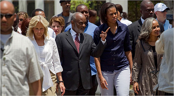 Source: Internet (April 14, 2010): http://www.huffingtonpost.com/2010/04/13/michelle-obama-jill-biden_n_536006.html. Photograph: Michelle Obama, with President René Préval of Haiti, his wife, Elisabeth Debrosse, and Jill Biden, the wife of Vice President Joseph R. Biden Jr., on April 13, 2010. |