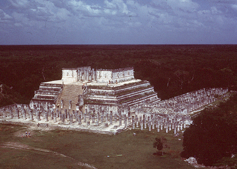 Notes: Looking out from the top of the central pyramid we see the Templo de los Guerreros (temple of the warriors). The columns supported numerous buildings that lined the central plaza. Panther, eagle, and serpent motifs are sculpted in/on the wall of this temple. The principal gods worshiped here were Quetzalcóatl and Chac. Chac is the Mayan name of Tláloc, the Aztec god of rain and other things. Quetzalcóatl is the Plumed Serpent god of the Toltecs and Aztecs. In Mayan this god was known as Kulkulkán or Gucumatz, depending on the Mayan dialect. |