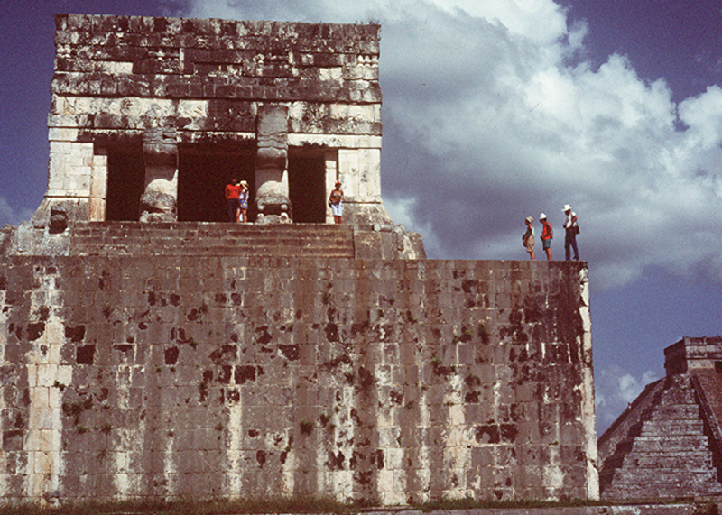 Source: WTL© photo. Notes: This is the viewing stand on one side of the ball court. The Castillo is in the background to the right. Some tourists were kind enough to let the photographer imagine that they were Maya-Toltec fans watching a photographer-player in the field of battle... |