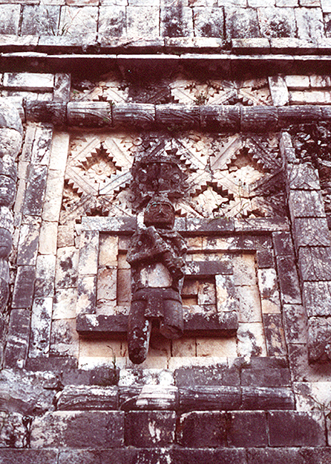 Source: WTL© photo. Notes: Here is one of the sculptures showing a victorious player of the ball game. Other scuptures show the victors decapitating the losing players. Comment: Note the architectural precision, the decorative exhuberance, the combination of geometric and anthropomorphic elements. Given the thousand-year of age of this site, there is also a clear sense of grandeur and permanence communicated by what the Mayas and Toltecs created in this and many more if their pre-Columbian sites. |