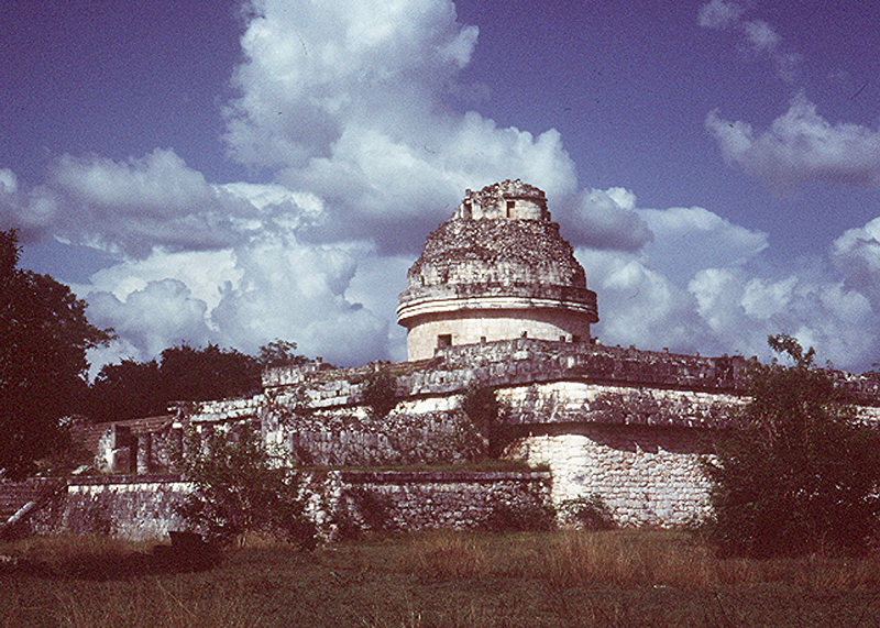 Notes: Here we see the building called the "snail" (> Span. caracol). It has this name because of a snail-like interior stairway. However, the central round tower, which is 16 meters high, is formed by two concentric galeries, and it has an observation room at the top. In other words, this structure was used as an astronomical observatory. The Mayas created a calendar of 365 days that was more accurate than the calendar used in Europe at the time of Columbus' arrival in the so-called New World. There were no circular buildings in the Mayan world prior to the arrival of the Toltecs ca. 1000. This indicates that Quetzalcóatl or other Toltecs brought this architectural knowledge with them to the Mayan civilization in the eleventh century. This architecture then fused with the Mayas advanced astronomical and mathematical knowledge. |