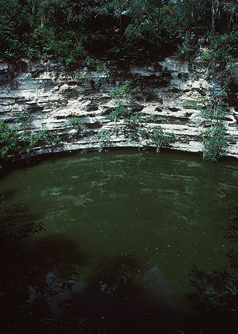 Notes: This is a picture of part of the Sacred Well (Cenote Sagrado), which is found 300 meters from the central plaza of Chichén Itzá. It is about 60 meters in diameter. From the level ground at the top down to the top of the water is 20 meters. The water is about 13 meters deep, and there are another 3 meters of mud at the bottom. This sink hole was used not for drinking water but for ritual purposes in honor of the god of Rain (Chac / Tláloc). During droughts sacrificial victims (often virgins) were thrown into the pit along with valuable objects, both of which were offered in order to propitiate the god. Bones of men, women, and children along with objects of jade, shell, carved bone, ceramic bowls, gold and copper jewelry, plates, cups, masks, necklaces, rings, bells, buttons, and axes have all been found in this Cenote. Near this Cenote are remains of what was probably a steam bath used in connection with this sacrificial rituals performed, probably from 1200 to 1500, at this site. |