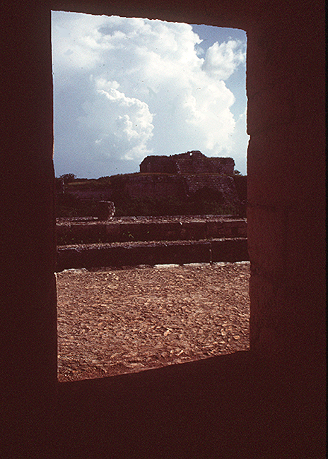 Comment: There is a mystery buried in this photograph. When the photographer-professor was leaving the Caracol (he was deeply impressed and moved during the visit), he noticed a quetzal bird (sacred bird of the Mayas on the ground just outside the portal you see here. He spent a long time waiting very quietly and motionlessly to see if he could snap a photo of this gorgeous bird, the name of which forms the first part of the god Quetzalcóatl's name. The bird stepped just inside the shadow of the doorway on the right. The photographer snapped the photo, but the bird is invisible due to the deep shadow. Mystery! An elusive Mayan god?