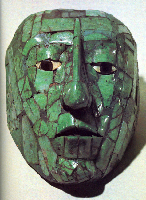 Notes: This is a funerary mask, which was found in a burial crypt in the Temple of the Inscriptions at Palenque, in Chiapas, southern México. It is from the late Classic Mayan period, some time after 692. You can see this mask, which is made out of jade, mother-of-pearl, and obsidian, in the Museo Nacional de Antropología, in Mexico City. You saw a photo of this museum in the Opening Slide Show (<= #66 and #67).