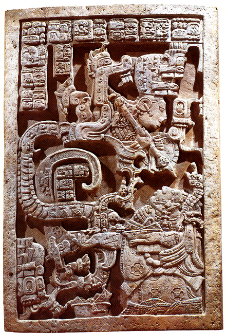 Comments: Here we see a bloodletting vision quest of a Vision Serpent on a bas-relief carving from the Yaxchilán Lintel 25. During the Classic Period, Yaxchilán was an ancient Mayan city-state alongside the Usumacinta River in present-day Chiapas, México. A lintel is the area surrounding a doorway. The Usumacinta River is known as the "sacred river of the Maya."
