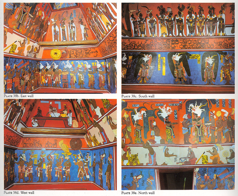 Notes: Here we see copies of four painted walls in Room 1 in the Mayan archeological site at Bonampak in Chiapas, México (ca. 800). These scenes depict the court rituals of designating a successor to the throne. On the east wall we see a child presented to the court. On the south wall, Bonampak lords dress for a celebration held 336 days after the first scene. On the lower left (west wall), there is a procession honoring the lord. On the lower right (north wall), the lords are entertained by musicians playing percussion and trumpets.