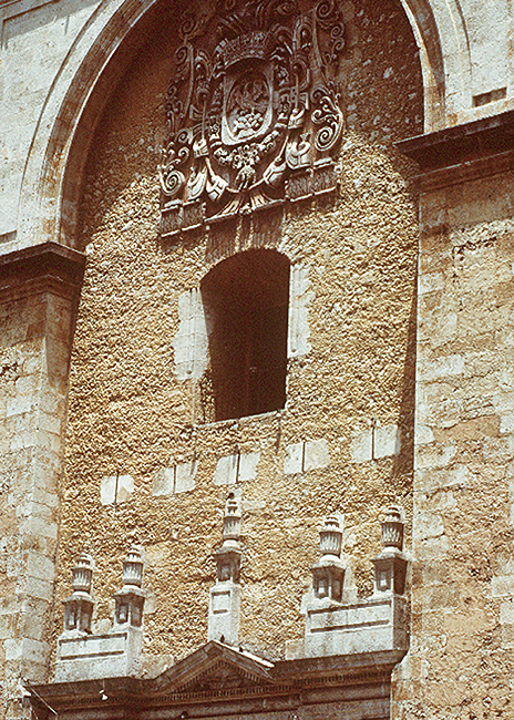Notes: Here we focus on the very sober area on the façade surrounding the window that is called the rose window in Gothic churches. Here, however, we see the cathedral's elegant crest above a bare area within a Renaissance arch. The window is small, and there is minimum decoration. The next page (=> Mérida #6) will show in more detail why there are so few openings on this exterior walls of this cathedral compared to other European-style cathedrals with elaborate stained glass windows.