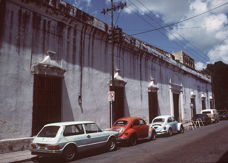 Notes: Here you see an example of a seventeenth-century Spanish colonial style building. This building has an undecorated exterior, strong rejas (wrought iron bars) on the large windows (for security), thick walls (to protect against the heavy heat in Yucatán), and white stucco (to reflect the sun's rays). Sober exteriors belie elaborate and gracious patios on the inside. This architectural pattern is found throughout Latin America, which reflects a style typical of Spain, especially southern Spain (Andalucía).