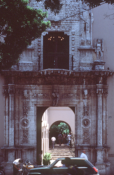 Left: this is the façade of the conquistador Montejo's palace. Notice the elegant Renaissance style around the principal portal; above, on the second level we see an aspect of early Spanish Renaissance style--a style favored by old-family, early 16th century, conquistadors--called Plateresque. Also, notice, at the top right of this particular entrance way, the bas relief statue of a conquistador. Also, notice the interior patio leading to a garden beyond, all on the inside of this mansion, which, nowadays houses a bank.