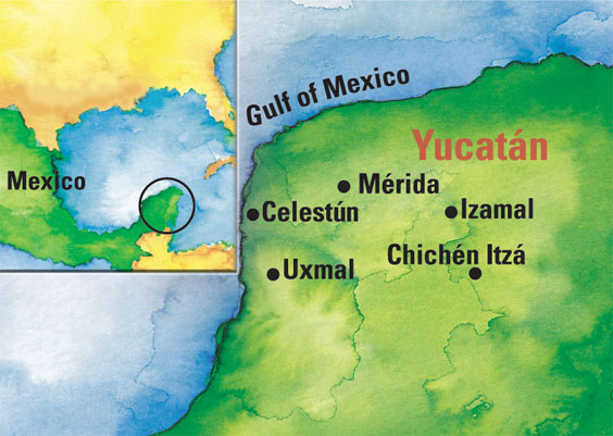 Notes: Yucatán is the name of the Mexican peninsula that points toward Cuba and Florida. It is also the name of one of the 31 states (estados) of the Mexican republic. There are two other Mexican states on the Yucatán peninsula: Campeche and Quintana Roo. The Yucatán Strait separates México from Cuba and it also separates the Gulf of México from the Caribbean Sea. Remember that this strait is important to Florida during the hurricane season because there is a warm Atlantic current that enters the Caribbean from the east, flows west, turns north through the Yucatán Strait, enters the warmer waters of the Gulf of México, and, depending of many variables, generates the flow of wind and water that become hurricanes that often affect Florida. Caribbean hurricanes often devastate Yucatán. Indeed, the word "hurricane" comes from a Caribbean Arawak word referring to severe tropical cyclones. In other words, we in Florida are intimately connected to Yucatán. Uxmal is on nearer the Gulf of México than Chichén Itzá or Mérida.