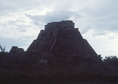 Comments: Here are two more views of the Great Pyramid / Magician's Pyramid of Uxmal. When we climb to the top we will enter the temple of the god that was honored by this pyramid. Contrary to what one might think, the (holy or sacred) temple is not the pyramid itself, but rather is only the construction at the very top. The architectural style is called "Chenes" (chen > Maya for "well", which dominates this region of Yucatán, as we see at => Chichén Itzá #16. In the Chenes style, profuse sculptural decoration covers the façade. In fact, the entire façade of this pyramid intends to represent or suggest the god Chaac (often spelled Chac, which spelling refers to something else). Chaac is the Mayan name for the god of rain.
