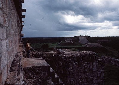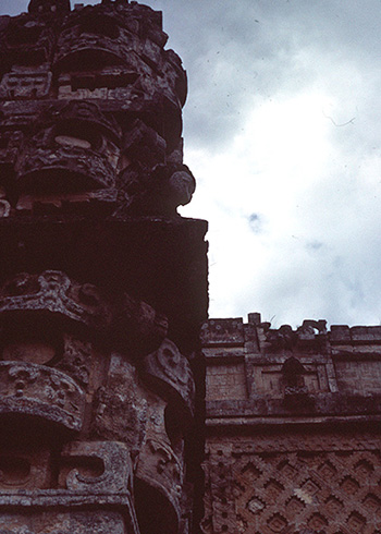 Notes: From where I was standing in the preceeding page (<= Uxmal #8), I turned around (south) to look at the precarious place I was standing, and I saw other pyramids and ruins on the Uxmal site (left photo). We shall visit these sites shortly. The sun had come out momentarily, but the clouds were still threatening. The temple of Chaac is smack dab on my left. Then I looked up and saw myself threatened (?) by sheer pre-Columbian admiratio, the Chenes style of façade decoration where virtually the entire surface was covered with symbolic carving. (See: <= Latin American Terminology #6 for a definition of admiratio.)