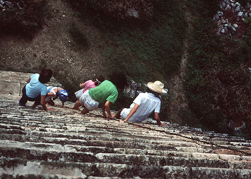 Notes: This narrated visit (more story than lecture, right?) continues... It's time to descend. The steps were wet from the recent rain. (I waited a half hour for the steps to dry a little. My situation was actually dangerous. I was wearing (good) leather shoes. I was carrying a full camera bag. I was wearing a hat. I tried to throw the hat down to the bottom of the staircase in order not to lose it on the descent, but a sudden wind caught it half way down and pushed it off to an inaccessible side of the pyramid: my sacrificial offering to Chaac? So, looking down I saw these good people grabbing the chain and climbing down very carefully. My turn next?