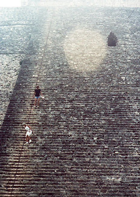 Source: WTL photographs© on site at Uxmal Archeological site in Mexico. Comment: At the bottom of the pyramid, we stand back and take a longer view of the descent from the top of this unusual pyramid. As you can see, it's a fairly tricky climb.