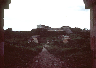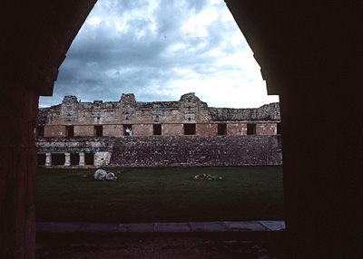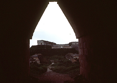 Humanities Comments: The arch (a.b.c.) is the famous Mayan corbel arch, which is not exactly an arch per se, and which latter (that is, an arch per se) pre-Columbian architects did not know how to construct. Rather it is an arch-like structure in which the sides gradually extend inward until they simply meet at the top. In this series of four photos, starting at the top left, the camera's zoom lens progressively focusses in on the north building in the Nuns Quadrangle. In (a) and (b), we are looking through the ball court toward the so-called Nuns Quadrangle.