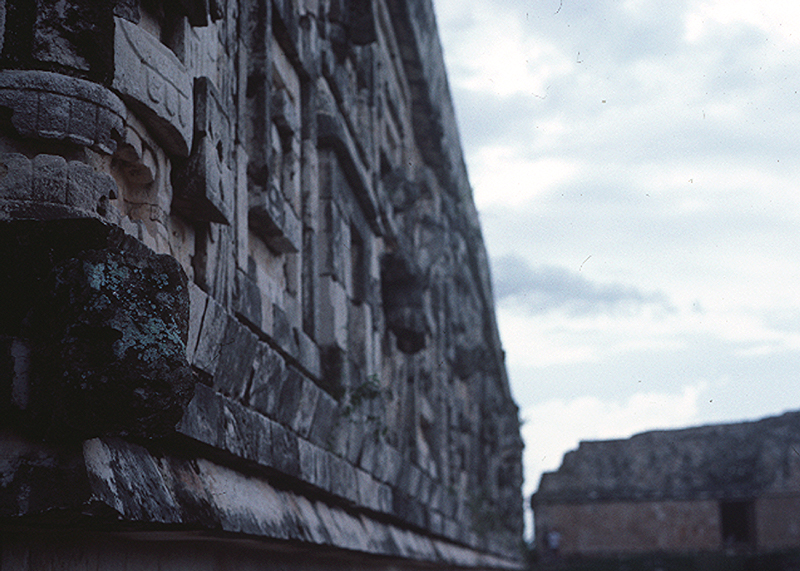 Notes: Before entering the Nuns Quadrangle, the photographer nearly bumps into the corner of a wall on the Governor's Palace decorated with an elaborate frieze in the Chenes style.