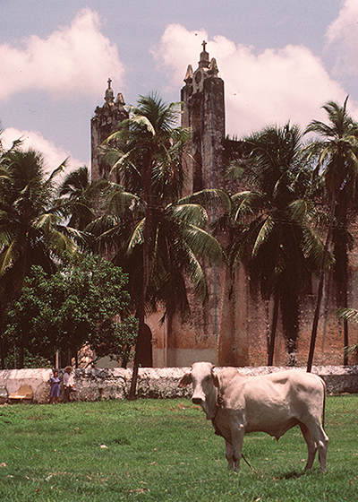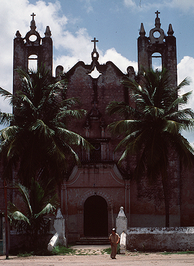 Notes: Two views of a church in rural Yucatán. (The clouds moved after I took the photo in front of the church.) By the way, Latin American churches with two towers tend to be the products of Jesuit missionary architects. By contrast, one-tower churches often are Franciscan in design.