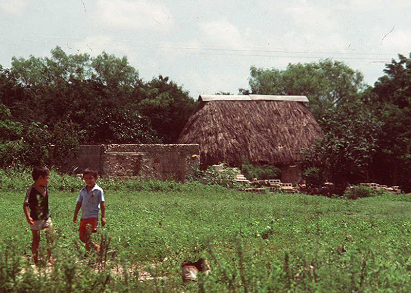 Notes: Two Mayan boys playing in a field near their home, the thatched-roof dwelling in the background. The home is an architectural style that contrasts with the church architecture in the previous page. You can enumerate the ways in which the two styles (humanities) contrast.