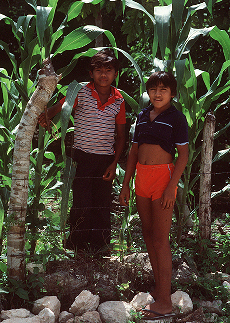Notes: Two yucateco boys standing alongside the road in front of a cornfield. Corn was the great crop of all Mesoamerica during its grand years of glorious prosperity (300 - 1200).