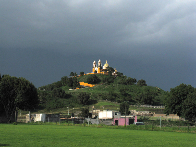 Image: The entire middle lower middle area of this photo roughly from the buildings in the foreground to the church at the top of the "hill" was once the pyramid of Cholula. Before it was dismantled by the Spanish colonists in the second half of the 16th century, the pyramid here was the largest pyramid in the world by volume. When most of the construction materials were scavenged by the colonists to build the new colonial city where the major and magnificent Cholulteca city had been on the same site, the great mass of the pyramid reverted to nature: years of dust, dirt, seeds, etc. built up to produce what became just another hill, except for the fact that the Spanish colonists built a church on top of the hill, a church that is maintained by ten different churches in the twin cities of modern greater Cholula for a period of a decade each.