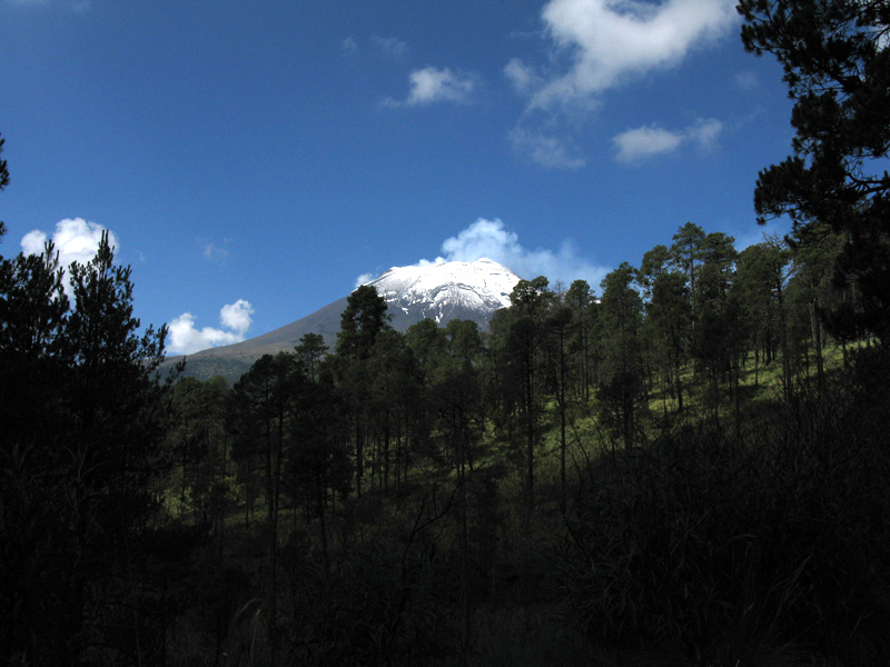 Comments: The professor-photographer stopped alongside the extremely rugged, rocky path of a road up the eastern slope of the mountain range to snap this view of Popocatépetl. At the top you see some steam coming from the crater. When Cortés, leading his several hundred Spanish conquistadors, several thousand indigenous warrior allies, dozens of African slave porters, and dozens of women camp followers, came this way in 1519 he and they would have seen a similar view. Cortés, Bernal Díaz and other chroniclers of the trip reported that it was extremely cold. The professor-photographer reports that he found it fairly chilly on this day in August.