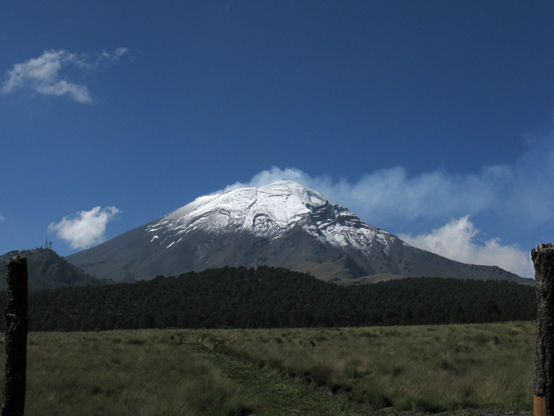 Comment: For a photo of the professor-photographer taken by his drive from this vantage point, see: => Paso de Cortés #6a. For a model of the twin volcanos Popocatépetl and Ixtaccíhuatl, see the image at: => Panoyán (6a).