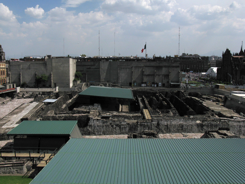 Source: WTL© digital photograph (2009) taken from the fourth floor of the Porrúa bookstore on the Calle Justo Sierra overlooking the archeological site of the Templo Mayor, Mexico City. Comments: To the extreme left is the site's magnificent museum; in the upper left is a colonial building; the cement wall across the top is a retaining wall to protect colonial buildings still standing on the other side of the wall when the site was excavated; in the far upper right is the Zócalo and the Churrigueresque chapel (see: => Mexico City #6) that adjoins the Catedral Metropolitana (see: => Mexico City #5). The two city blocks of this archeololgical site were an old neighborhood of delapidated colonial and 19th century buildings that was known as the "Island of the dogs" because it was somewhat higher than surrounding areas (see the level of the top of the ruins), and stray dogs congregated here. When the public electric company was digging in this area in 1978, they made a major archeological find; that is, the giant stone disk of Coyolxauhqui (See: => Templo Museum #3). From that find onward, the old buildings (13 total) were razed and excavation began. (Note: WTL's first visits to this area took place before the discovery and excavation; when he returned, excavation had begun; then he took these photos during his 2009 visit.) Humanities question: Obviously, this photo is a prime example--one among many, of course--of cultural and humanities complexity in Latin America. Reflect on this photo from top to bottom and from side to side. |