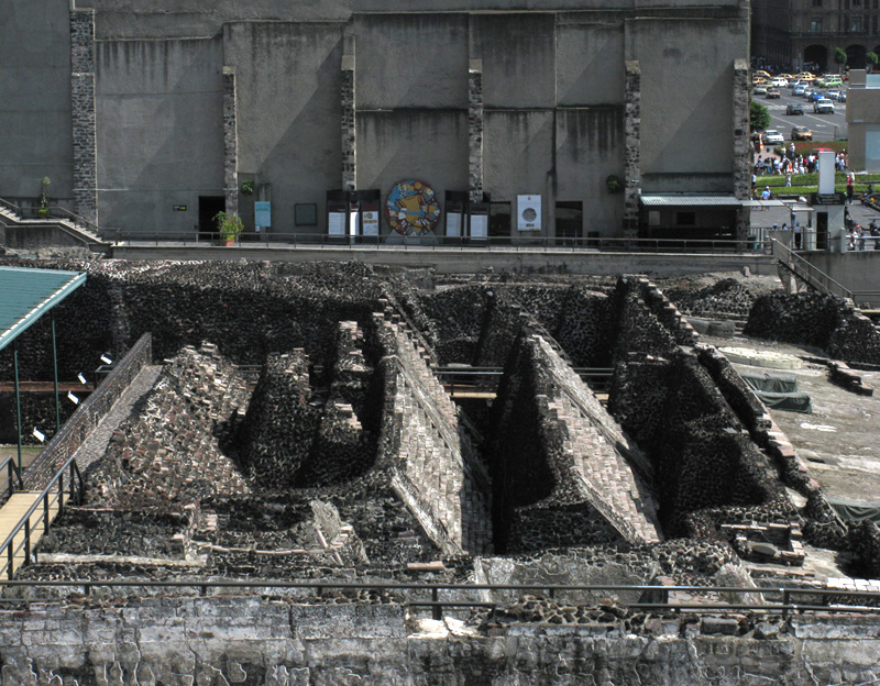Source: WTL© digital photograph (2009) taken on site at the Templo Mayor, Mexico City. Comments: In this photo, which was taken from the fourth floor (tercera planta) of the terrace café run by the great Mexican bookstore Porrúa on the Calle Justo Sierra (great fruit smoothies and deserts!), you can see, counting from the left next to the walkway, stages 2, 3, 4, 5, 6, and 7 of the huey teocalli's construction. The first stage, which was the smallest and probably was built of perishable mud and wood is somewhere under the covering at the left. Here are the dates of the construction stages: (2) 1375-1427; (3) 1427-1440; (4) 1440-1481; (5) 1481-1486; (6) 1487; (7) 1487-1519 (the platform on the far right and a courtyard on the south side are all that remains of this last stage). In other words, this pyramid, like almost all others in Mesoamerica, were expanded over time by constructing a new layer over the older layer(s). The cement wall in the background marks the outer wall of modern dependencies of the archeological site. |