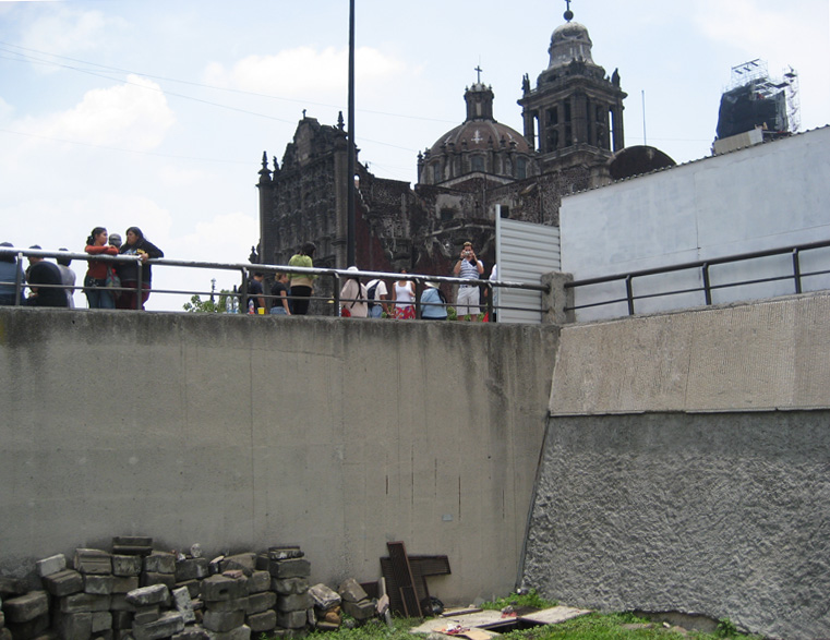 Source: WTL© digital photograph (2009) taken on site at the Templo Mayor, Mexico City. Comments: We are now beginning the tour of the archeological site. (The photographer at the raining above at current-day ground level and I were taking photos of each other. She was possibly interested in my Mexican hat.) Notice how much higher modern ground level is than, roughly speaking, ground level was when the Templo Mayor was a functional sacred site. When the Spanish conquistadors destroyed the Aztec capital, they tore down pyramids, palaces, and buildings and created a higher ground level. Some excavations of this site began in the first years of the 20th century, but serious urban renewal spurred totally serious and scientific excavation. Humanities Issue: Keeping in mind the brutal nature of the war of defense/conquest and the fact that Tenochtitlán / Mexico City was and is built in the middle of a lake and swamp, reflect on the fact of the double ground level. |