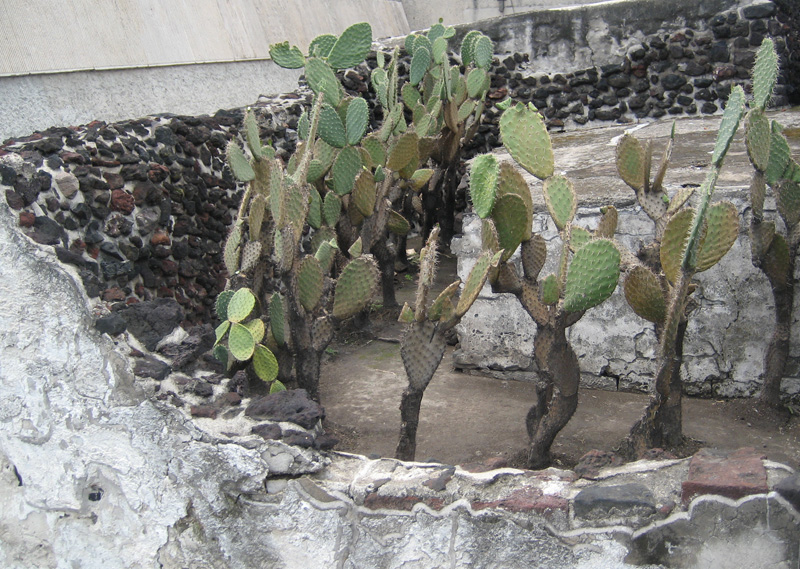 Source: WTL© digital photograph (2009) taken on site at the Templo Mayor, Mexico City. Comments: In the archeological site, these cacti are growing in order to remind visitors of the "miracle" of the serpent and snake perched on a cactus like one of these signaled the end of the Mexica/Aztec pilgrimage and the founding of their city on this "promised land." Humanities Issue: Think of mythical or magical events similar to this one that involve the founding of other cultures. Humanities Question: What is the name of the Aztec god you ordered his people to stop their wandering when they saw this sign? |