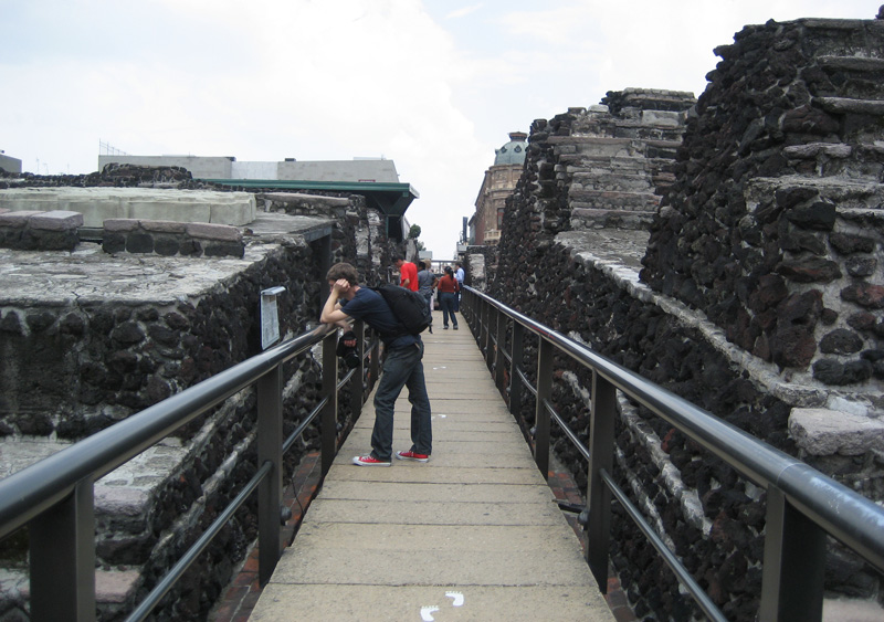 Source: WTL© digital photograph (2009) taken on site at the Templo Mayor, Mexico City. Comments: On our tour through the Templo Mayor archeological site, we pause often and take a breather, like the student-tourist ahead of us, to read the excellent descriptive signs distributed throughout the site. |