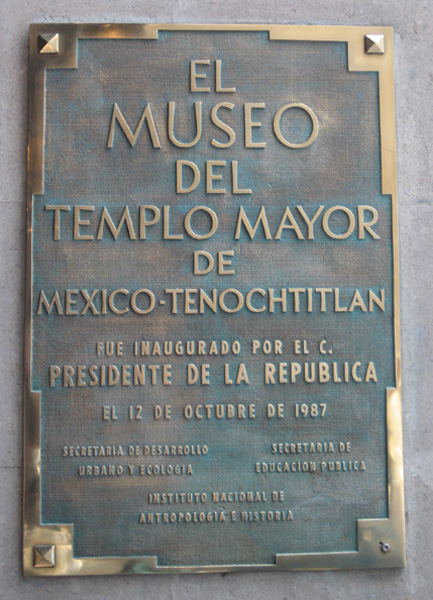 Source: WTL© digital photograph (2009) taken in the Museo del Templo Mayor, Mexico City. Comments: This shows the bronze plaque in the entrance to the museum: The Museum of the Great Temple of Mexico-Tenochtitlan. Humanities Question: Knowing that an art/artifact museums house humanities objects, how does this museum relate to the seven definitions of the humanities that anchor this course taking note especially of definition VII? (See: => Definition of the Humanities, VII.) |