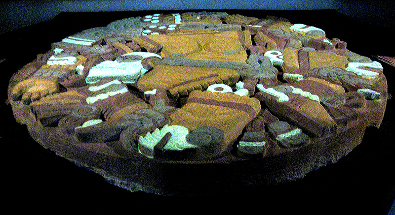 Source: WTL© digital photograph (2009) taken in the Museo del Templo Mayor, Mexico City. Comments: Photo in low light setting of the Stone Disk of Coyolxauhqui. In section IV of the Aztec Notes, reference is made to Coyolxauhqui. This giant carved polychrome stone is over 10 feet in diameter, it's a foot thick, and it weighs 8.5 tons. It represents the moon goddess (Coyolxauhqui), and it was carved in the 15th century C.E. Humanities Question: Using the presentation of Coyolxauhqui in class, compare and contrast this stone disk with (A) the Stone of Tízoc and (B) the Aztec Sun Stone. |