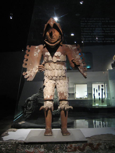 Source: WTL© digital photograph (2009) taken in the Museo del Templo Mayor, Mexico City. Image: Statue of an Aztec warrior. Remember this is not an actual warrior, but rather this is a humanities object. Humanities Questions: (A) How effective do you think the fighting uniform as represented on this statue was during the many winning wars the Aztecs fought? (B) What effect would such an Aztec warrior's uniform have had on a Spanish conquistador? (C) Compare and contrast this warrior with the figure of the conquistador in the museum in Cuernavaca. |