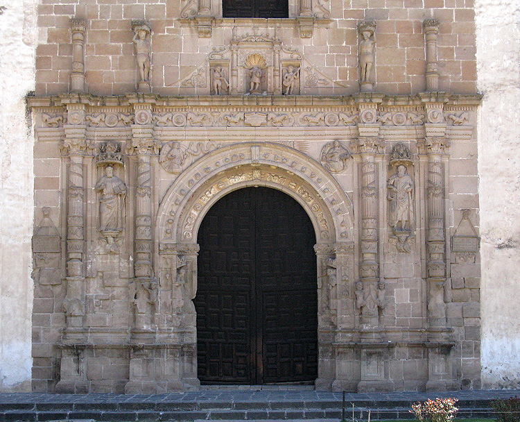 Source: WTL© digital photograph taken on site at the former monastery of San Agustín Acolman. Comments: Here is the core of the Plateresque façade. The main door features Spanish-style wood carving, which was probably executed by newly trained Aztec artisans. Flanking the main door are two pairs of garlanded columns sitting on angel pedestals. A niche with the statue of a saint sits between each pair of colums. Above the portal are three small statues: in the middle is a now headless statue of St. Augustine. It is flanked by two angels playing musical instruments. Humanities Topic: Contrast Acolman's façade with the most renowned of all Plateresque façades in Spain: => San Gregorio, Valladolid, Spain. |
