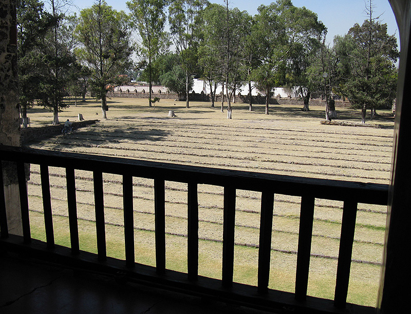 Source: WTL© digital photograph taken on site at the former monastery of San Agustín Acolman. Comments: This photo is taken from the second-floor open air altar looking out toward the gentle terraces in front of the chapel where the Indians would have assembled to hear mass. Embedded image: for a view behind the altar, to the photographer's back in this view, see: => Acolman #7a. |