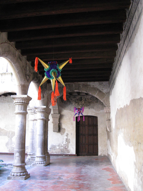 Source: WTL© digital photograph taken on site at the former monastery of San Agustín Acolman. Comments: Here you see two piñatas hanging just to the left of the museum's entrance. The Mexican tradition of the Posadas (inns) was born right here in the monastery of Acolman. It began in 1587 when an Augustinian friar obtained permission from the pope to say the first of the sung "misas de aguinaldo" (Christmas gifts and carols, December 16-24) here. These dates coincided precisely with the Aztec dates for the birth of Huitzilopochtli. These masses evolved into the posadas / inns that Joseph and Mary stayed in on their Nativity journey to Bethlehem) during whose parties piñatas filled with candy are broken, spilling the goodies hidden inside for children of all ages. The piñatas' traditional form is a seven-pointed star, symbolizing the seven capital sins. The candies symbolize worldly pleasures. A blindfolded person tries to smash the piñata (the struggle between good and evil) with a stick (symbol of faith) in order to overcome worldly temptations. A traditional song is sung by festive observers: "Dale, dale, dale / no pierdas el tino / porque si lo pierdes / pierdes el camino" (Hit it, hit it, don't lose your aim, because if you lose it, you'll lose your way). Embedded image: For a close-up of the closest piñata, see: => Acolman #8a. |